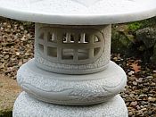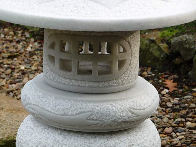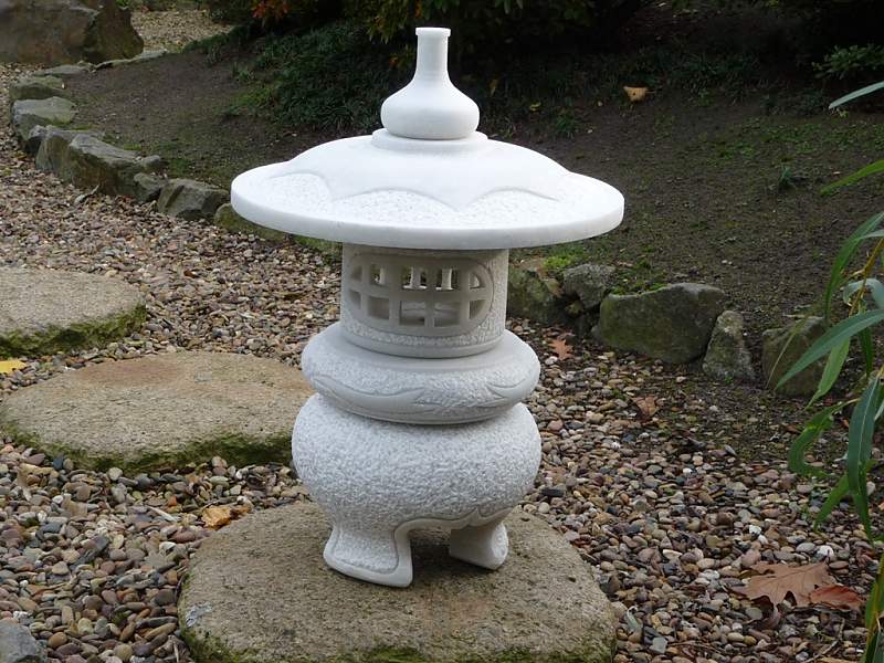 Die geschwungenen Beine und das verzierte Dach lassen den chinesischen Einfluß sofort erkennen. Diese Schneebetrachtungslaterne ist eine Zierde für jeden Garten.