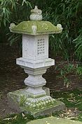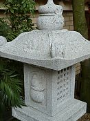 Eine Laterne ist gewöhnlich das Hauptelement einer Gruppierung, wobei verstreut liegende Steine für eine Art Höhenausgleich sorgen. Durch den hohen, viereckigem Lichtkasten und ihrer kantigen Linienführung wird die Wirkung dieser Steinlaterne schon von Weitem betont. Da der Fuß nur teilweise aus dem Sockelfelsen gearbeitet ist, wirkt sie wie aus dem Felsen geschlagen.